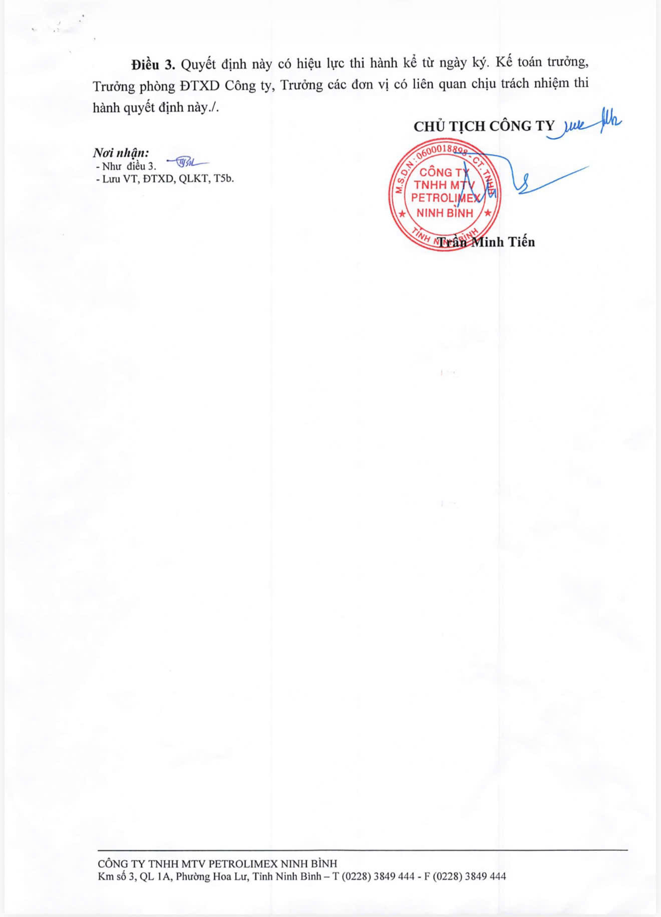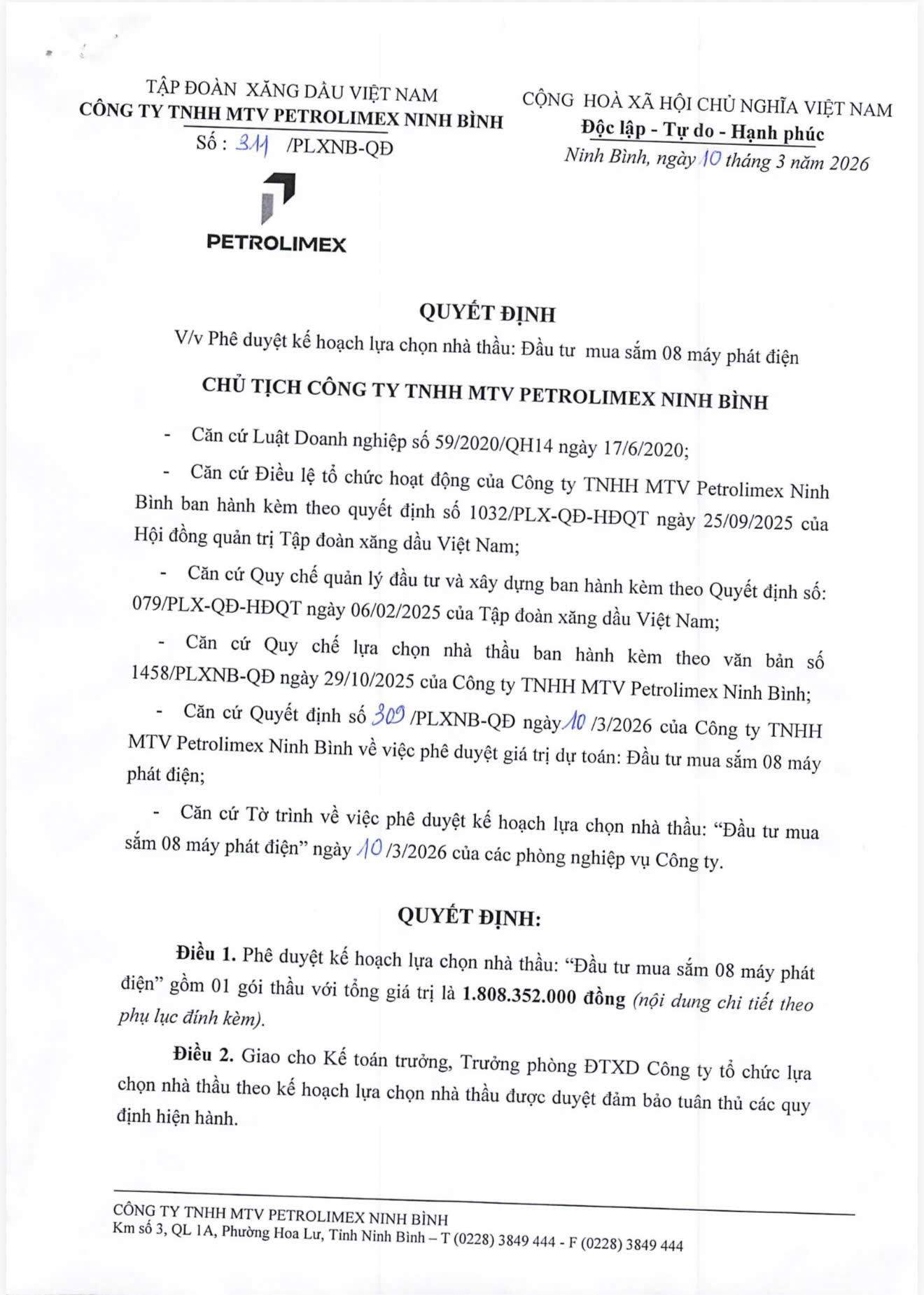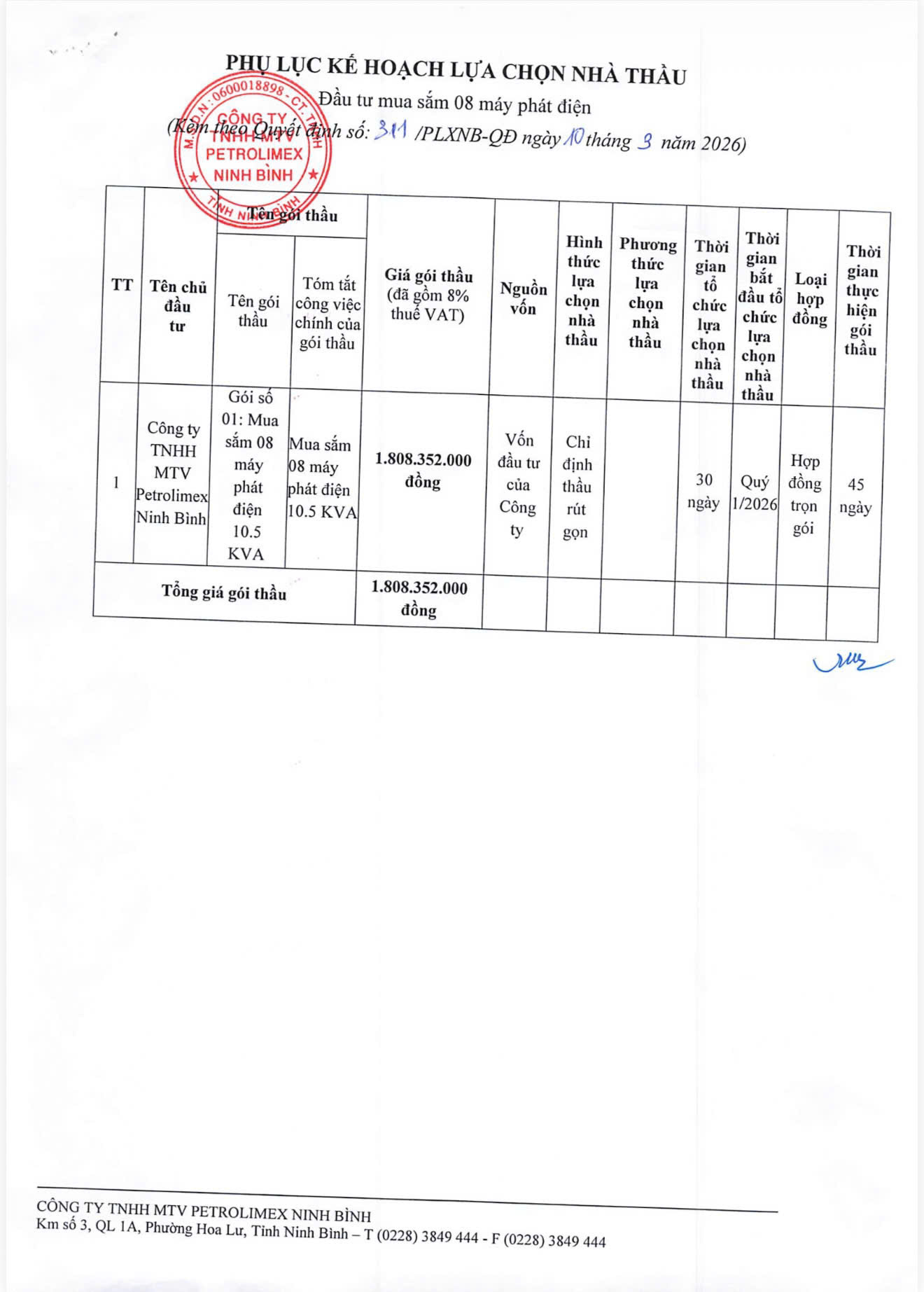 Căn cứ Quyết định số 311/PLXNB-QĐ ngày 10/03/2026 của Công ty TNHH MTV Petrolimex Ninh Bình về việc phê duyệt kế hoạch lựa chọn nhà thầu: Đầu tư mua sắm 08 máy phát điện.