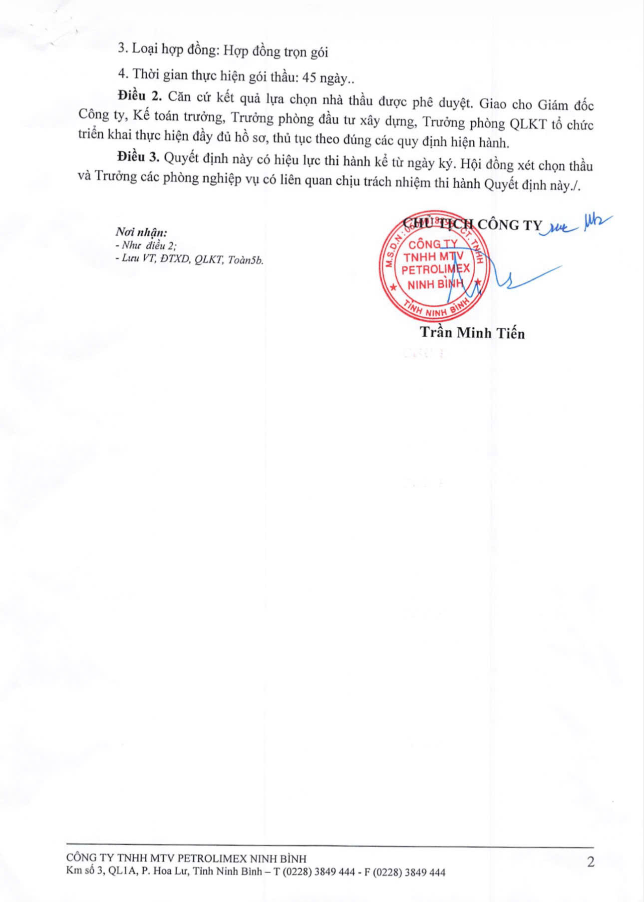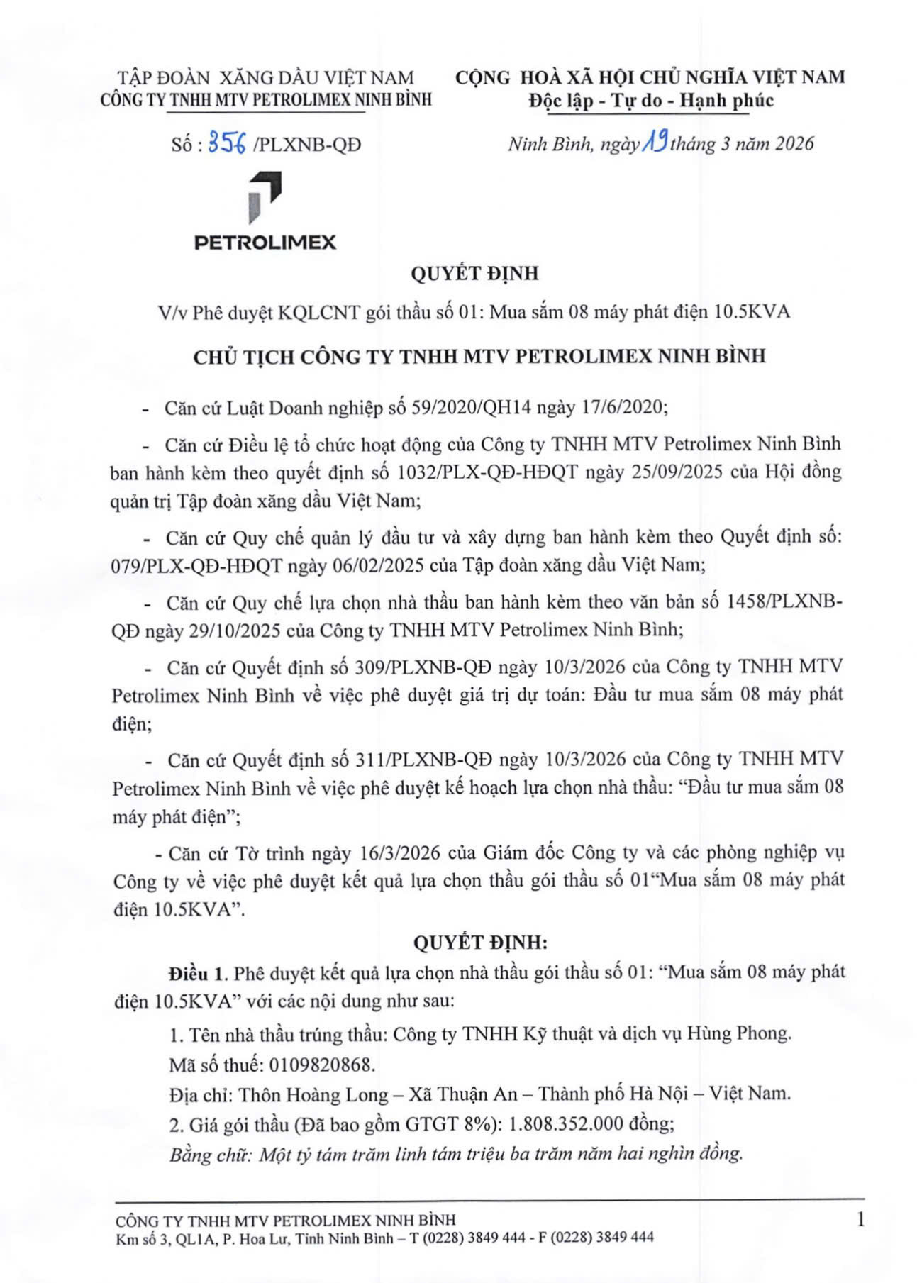 Căn cứ Quyết định số 356/PLXNB-QĐ ngày 19/03/2026 của Công ty TNHH MTV Petrolimex Ninh Bình về việc phê duyệt kết quả lựa chọn nhà thầu gói thầu số 01: Mua sắm 08 máy phát điện 10.5KVA.